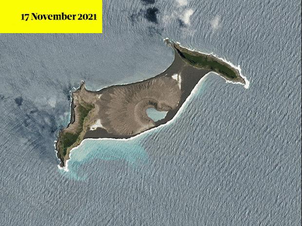 喷发后拍摄的卫星图像显示,连接的火山锥已被基本摧毁。此后,汤加气象局向全国所有岛屿发出海啸警告,火山爆发后记录到的海浪最高达30厘米。