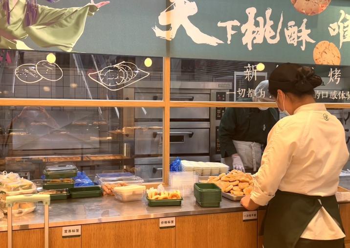 在一家新中式烘焙门店里,一位前来购买的上海大爷询问店员。透过店员身后的玻璃橱窗,可以看到来回忙碌的店员和亮着灯的烤箱。在得到肯定的回答之后,大爷选购几样点心,心满意足地扫码付钱离开。