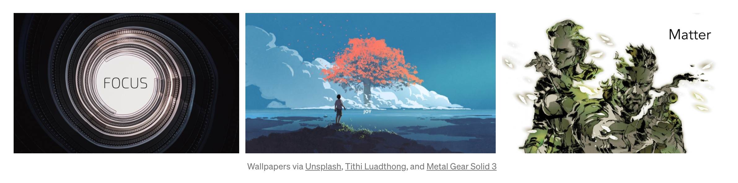 最后,如果你永远铭记你的主题,我建议你每年选一张专用的壁纸来描述它。我每次会选择一个在视觉上与我产生共鸣的图像,然后在上面写下主题词,并将其设置为手机和桌面壁纸。比如: