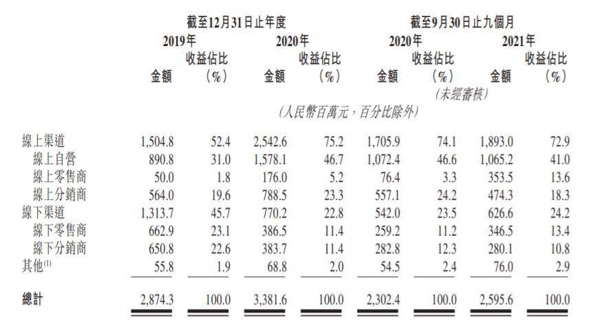 2019年后,上美集团开始加大线上布局,建立了线上自营、经销商和分销商渠道。2019年,上美集团线上渠道收入达到总收入的52.4%,2020年大幅增长至75.2%,2021年前三季度降至72.9%。
