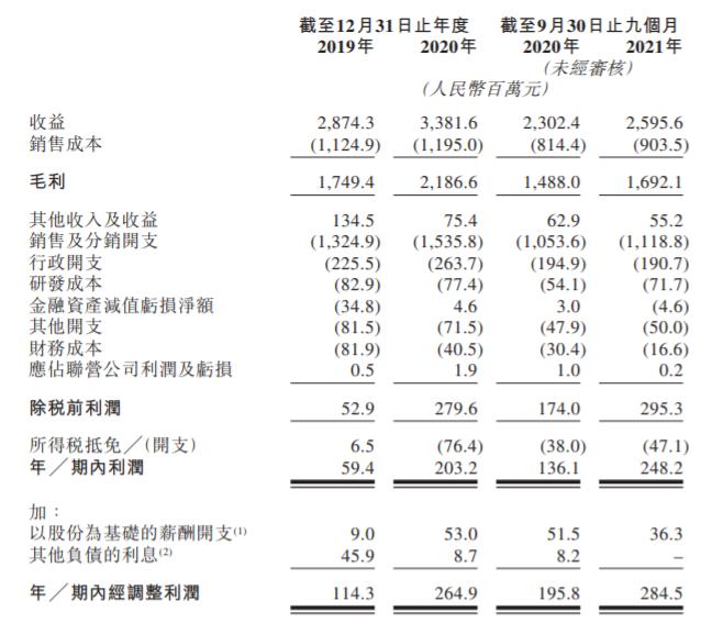 2019年至2021年三季度,上美集团分别实现收益28.74亿元、33.82亿元和25.96亿元,期间同比增速为17.7%和12.8%。同期,上美集团的经调净利润分别为1.14亿元、2.65亿元和2.85亿元,期间同比增速为132.5%和45.4%。