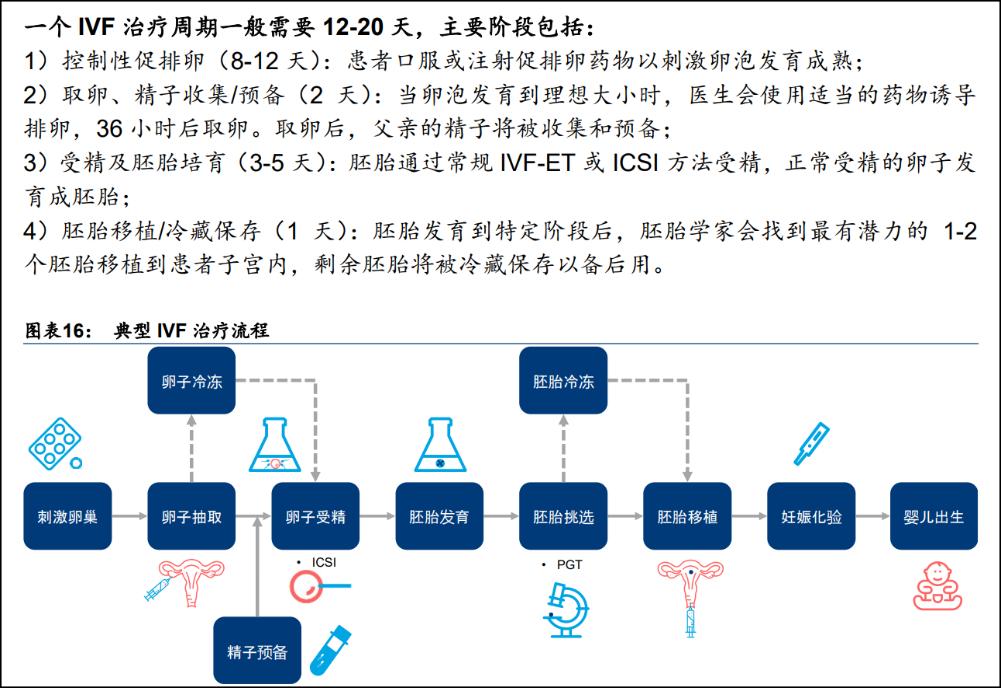 纵观不孕不育疗法的成功率,IVF (试管婴儿) 疗法以40-60%的成功率居首,可以说是不孕不育赛道的掌上明珠,其治疗过程如下图。