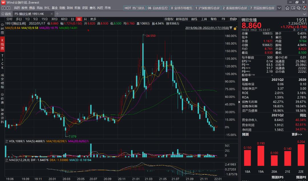 超级赛道的成长股,在上市之初可能因为消化估值导致股价不涨,可一旦上涨就很少有像锦欣生殖这样打回原形的:上市两年半,锦欣生殖股价最高时达到24.55港元,至今又跌回8港元左右。