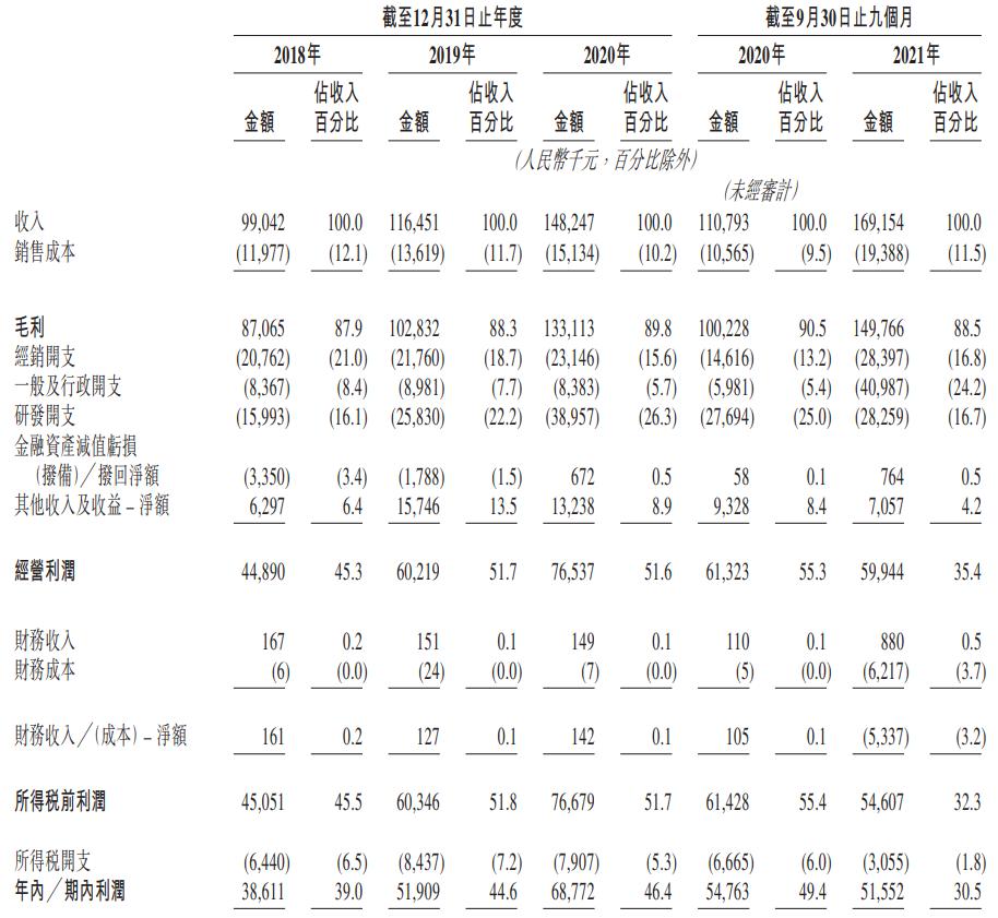 财务方面,公司的收入从2018年的人民币(下同)9900万元增加17.6%至2019年的1.165亿元,这主要是由于公司先天性心脏病封堵器产品的销量增加,收入进一步增加27.3%至2020年的1.482亿元,主要是由于封堵器相关手术配套产品及卵圆孔未闭封堵器产品的销量增加。该公司的收入由截至2020年9月30日止九个月的1.108亿元增加52.7%至截至2021年9月30日止九个月的1.692亿元,主要是由于产品的单价上涨。
