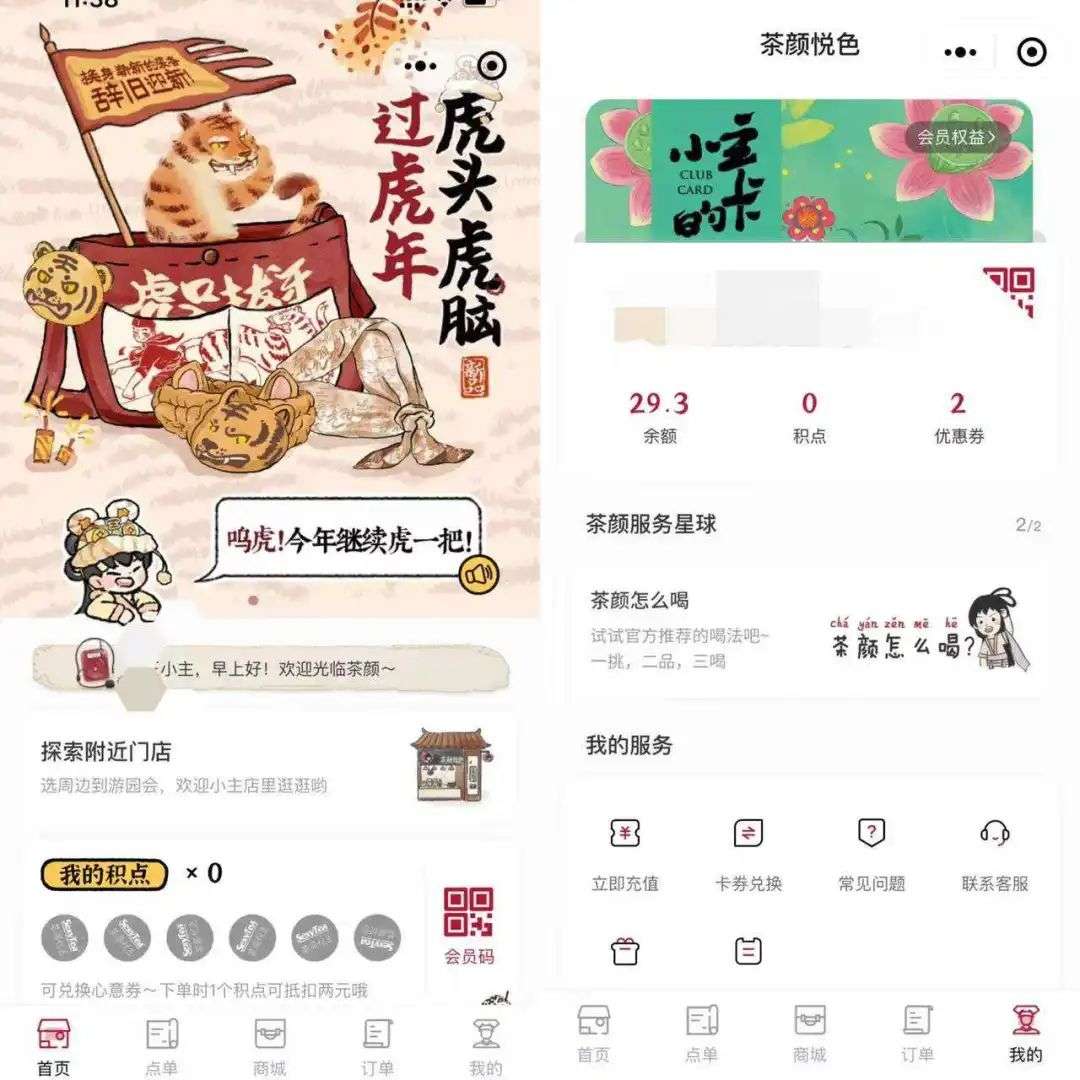 在茶颜悦色的许多门店旁边,会张贴下载线上点单App的二维码,消费者可通过该App在指定门店线上下单、点外卖等。同时,茶颜悦色也上线了具备点单、集点、充值等功能的小程序。早期,茶颜悦色可以根据纸质集点卡换取贴纸、茶包、杯子等周边产品,不过小程序上线后就取消了纸质集点卡。