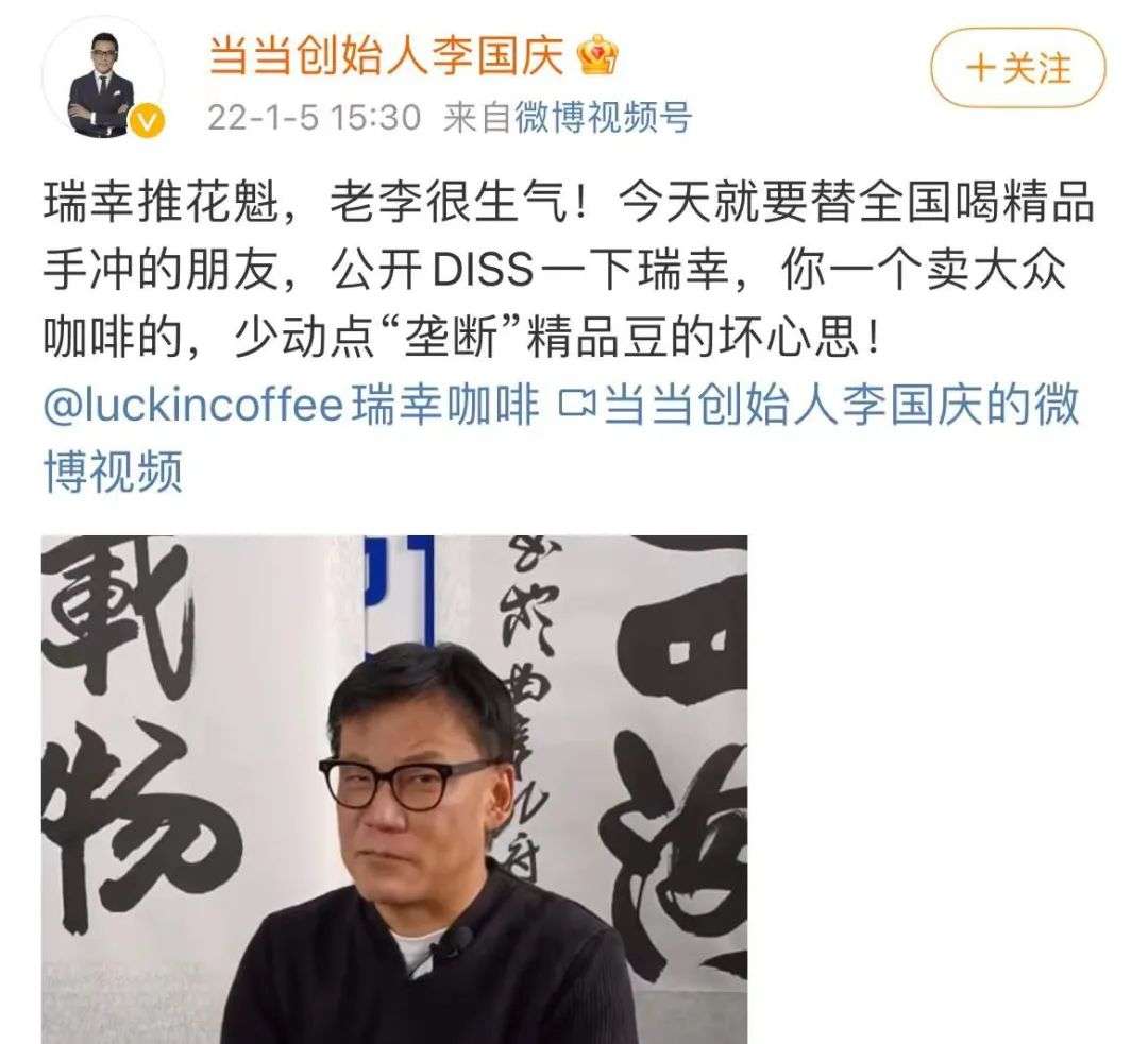 1月5日,李国庆发布视频炮轰瑞幸,“瑞幸推花魁,老李很生气,今天就要替全国喝精品手冲的朋友,公开DISS一下瑞幸,你一个卖大众咖啡的,少动点‘垄断’精品豆的坏心思!”