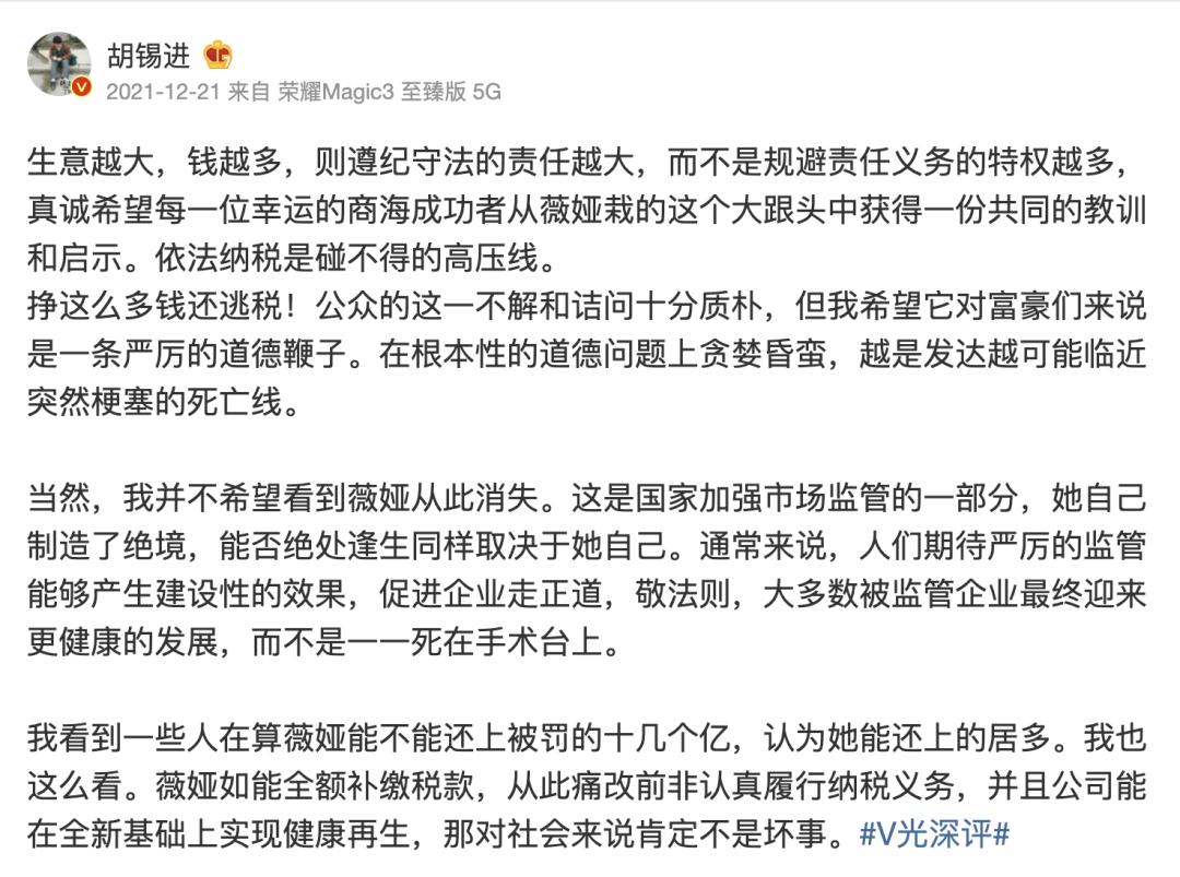 环球时报总编辑胡锡进说:我并不希望看到薇娅从此消失。敬法则,大多数被监管企业最终迎来更健康的发展,而不是一一死在手术台上。