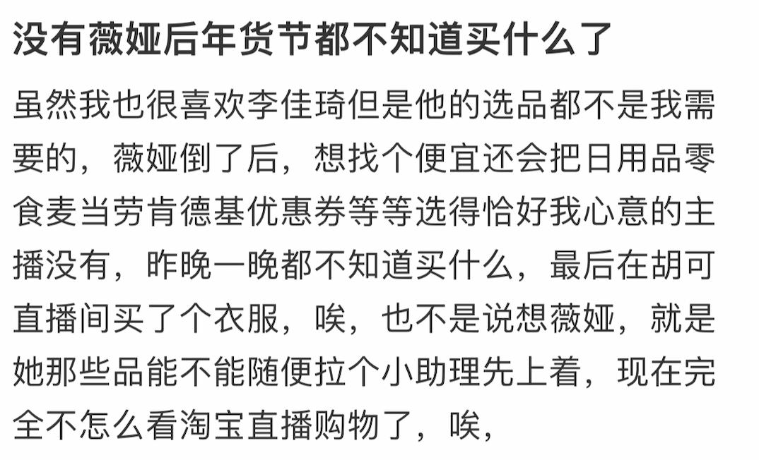 有人在小红书上发文说,没有薇娅后年货节都不知道买什么了。类似的发帖和留言还有很多。