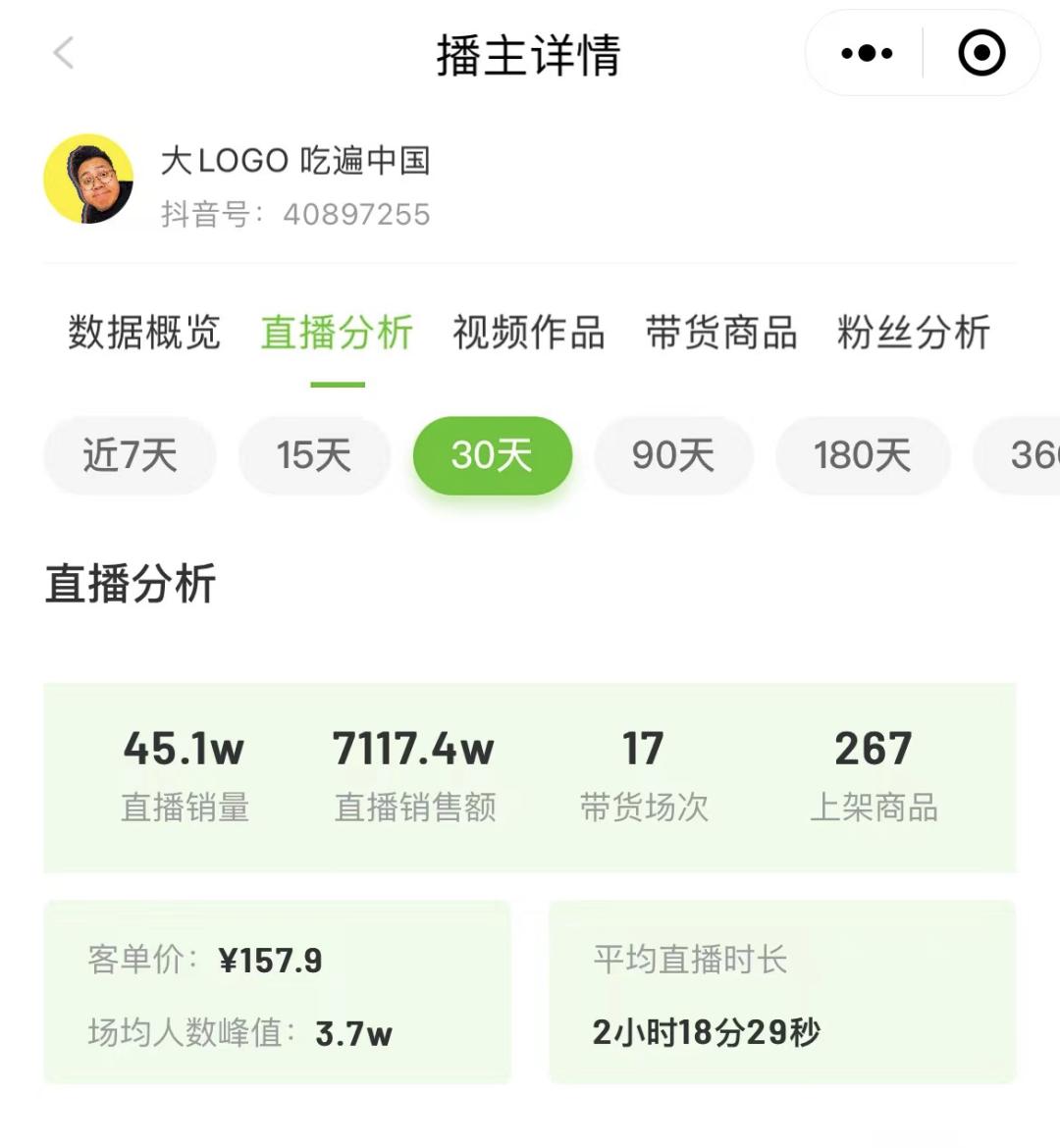根据飞瓜数据平台显示,跟谦寻供应链合作的抖音主播大logo,在薇娅被封以后,带货17场,总GMV达到了7100w。