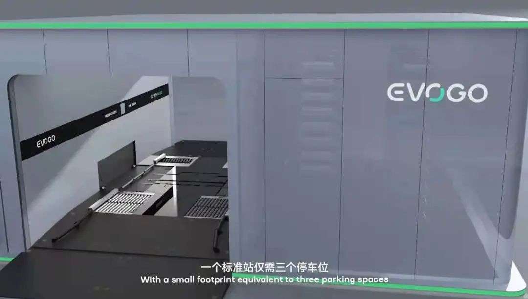 快换站,一个标准站仅需三个停车位,站内可以贮存48块换电块。不同版本的换电站可以适配不同地区的气候环境。