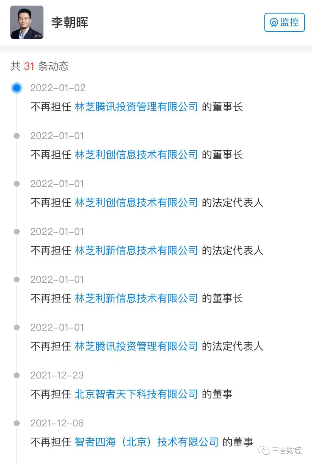 此外,近日李朝晖接连退出多家腾讯关联公司法定代表人或董事长职务,包括林芝腾讯投资管理有限公司、林芝利创信息技术有限公司、林芝利新信息技术有限公司。