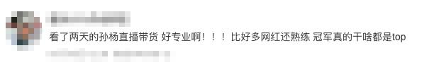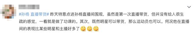 还有一些网友看完直播后,对孙杨的专业程度大为震撼,“虽然是第一次直播带货,但并没有很生疏的感觉,一看就是做足了功课的”、“比好多网红还熟练,冠军真的干啥都是top”……