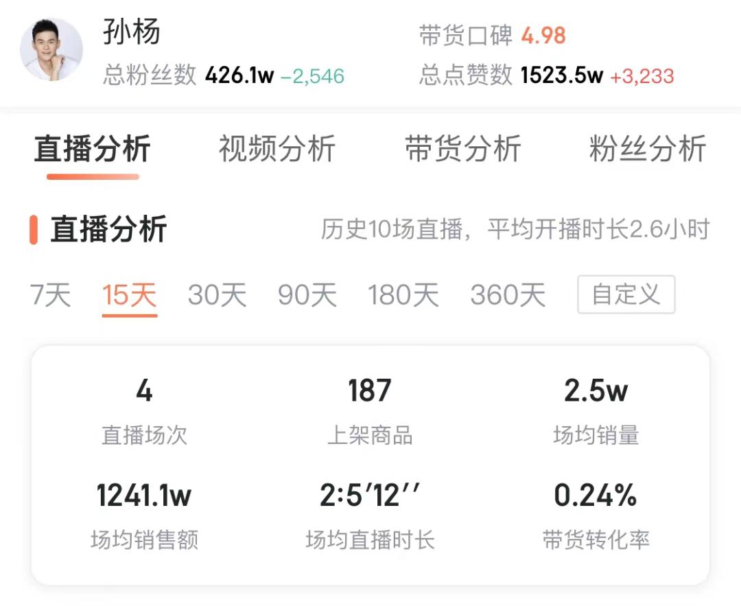 而通过这两天的直播分析数据来看,孙杨的场均销量为2.5w,场均销售额达到了1241.1w。