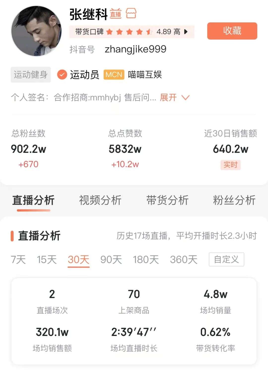 从最近一个月的数据来看,他直播场次仅为两次,频率并不是很高,场均销售额在320.1w,和孙杨的直播数据还是有明显差距的。当然,直播并不是张继科退役后的主业。