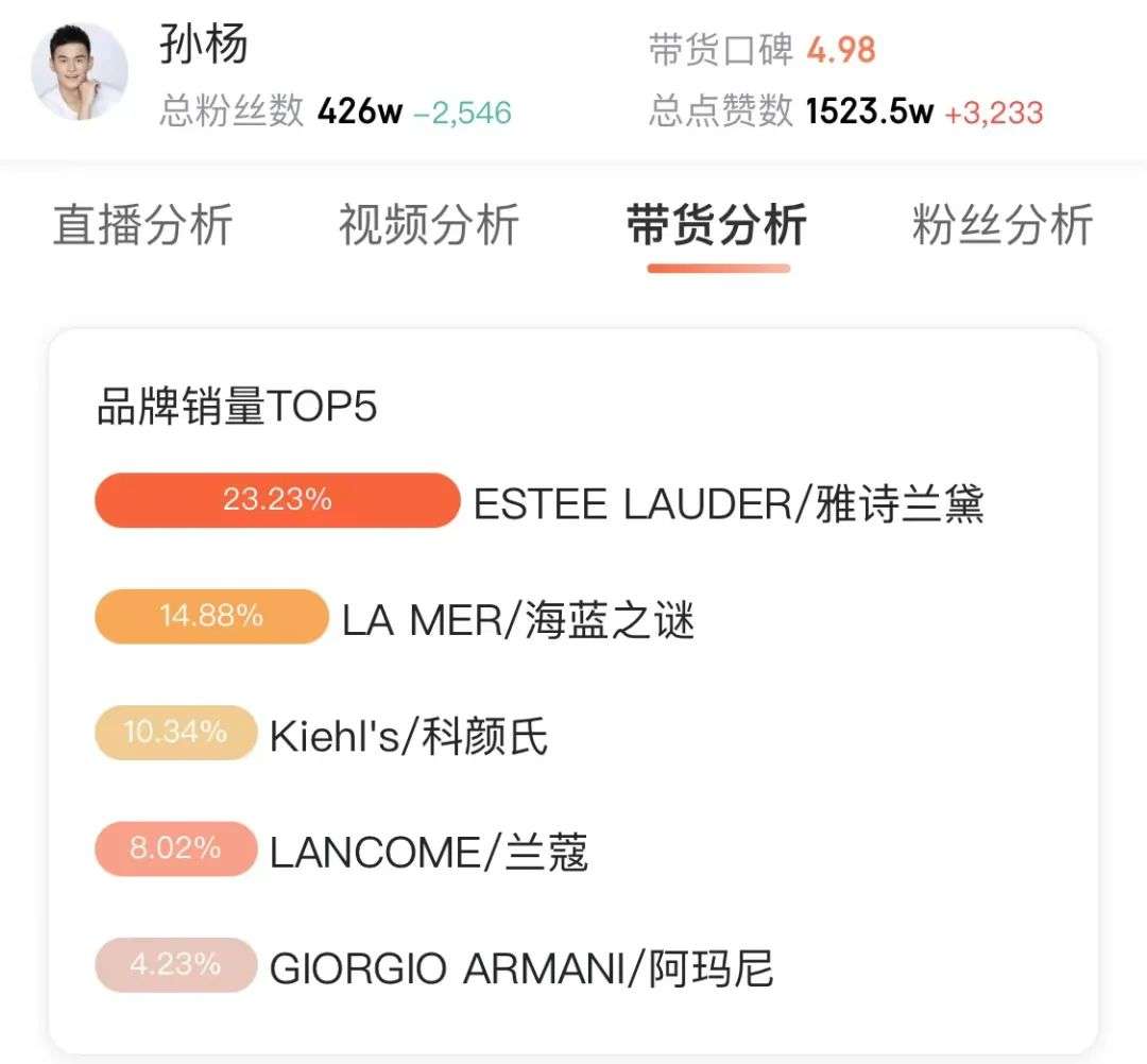 在直播数据中可以发现,他销量前五的品牌包括雅诗兰黛、海蓝之谜、科颜氏、兰蔻、阿玛尼等美妆大牌。当这些化妆品被扣上了“免税”、“折扣”等的字眼,足够可以获得女性消费者的欢迎和追捧。
