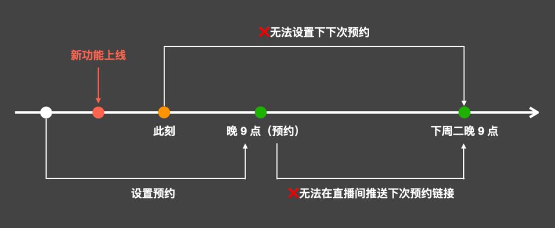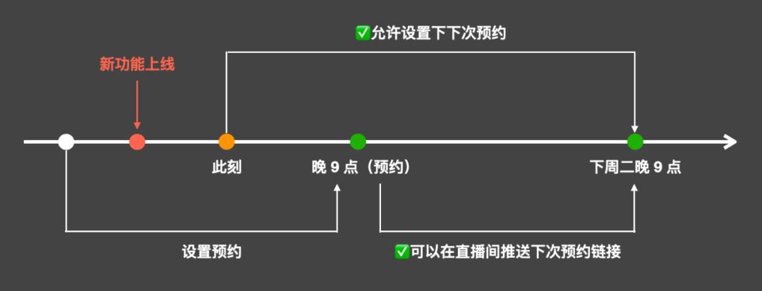 黄色节点是此刻,按照现有的功能逻辑,我是无法设置下下次的直播预约的,因为今晚的直播还没开始。