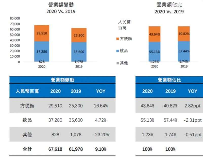 康师傅2019年与2020年销量对比,图/康师傅财报