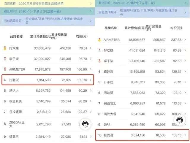 据悉,拉面说在经历一波快速增长后,2021年下半年开始经历下滑。在双11的首轮预售中,销售额相比去年接近腰斩,而在速食领域的排名也从去年的第四下降到第十。拉面说把价格做到了20元+,但在营销之后,也遭遇了口碑下降,复购难的问题。