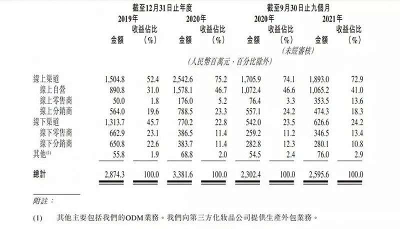 线上渠道的战略布局,使得上美集团迎来新的发展时代。2020年2月左右,线下销量下滑95%,但是线上渠道增长了107%。招股书显示,2019年、2020年及截至2021年9月30日止九个月,上美集团的线上销售额分别为15.05亿元、25.43亿元、18.93亿元,分别约占公司同期总收益的52.4%、75.2%及72.9%。