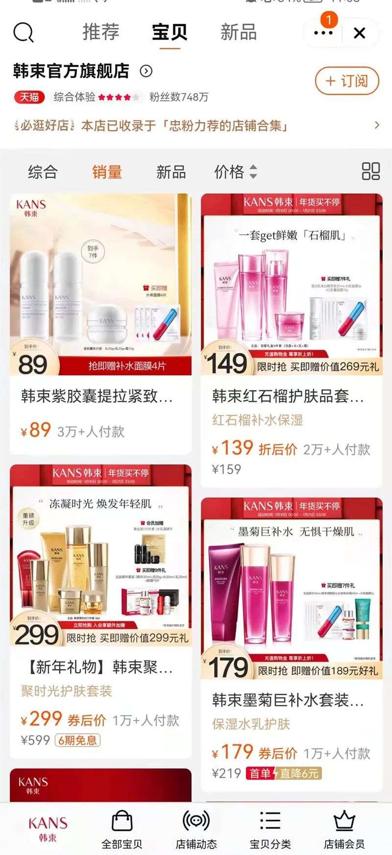 这样的产品策略代入到行业可以看出,当下韩束主推的抗老概念虽踩对了市场风口,但整体并未掀起过多水花。在韩束官方淘宝旗舰店中,销量排名前几的仍是石榴水、墨菊等早期系列。一叶子面膜在产品推陈出新方面,也略显乏力。近日新推出和屁桃联名的面膜新品,又走了重营销的老路,借助迪丽热巴和联名的热度营销。