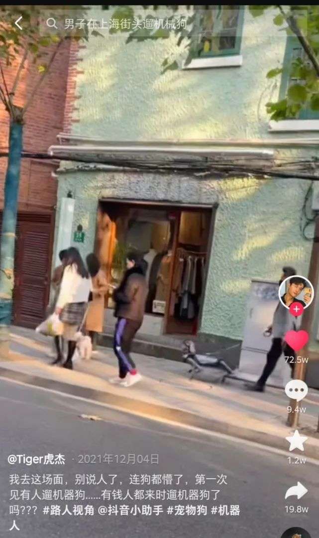 王京京同时也是科技账号“无魂胜有魂”的所有者,去年4月参加大厂活动拍摄到机械狗与真狗相遇的场面,在抖音播放超100万次。“以前工程师都觉得机械狗很昂贵,不会用它来逗狗,我也是比较赶巧,完全是意外拍摄。”