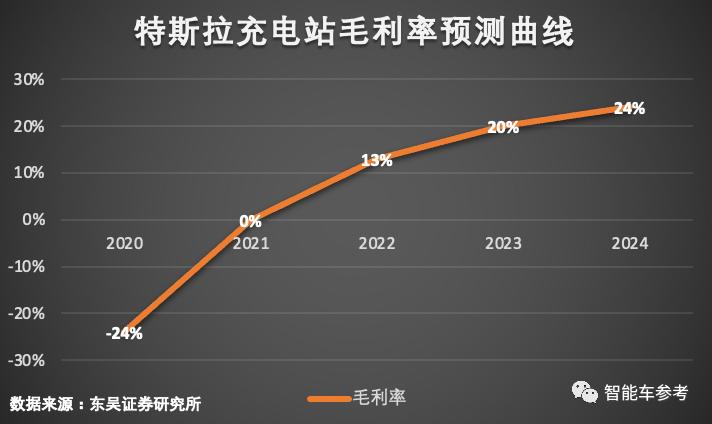 据东吴证券预测,特斯拉超级充电站毛利率在2021年来到平衡点,到2022年,毛利率将会大幅增长至13%。