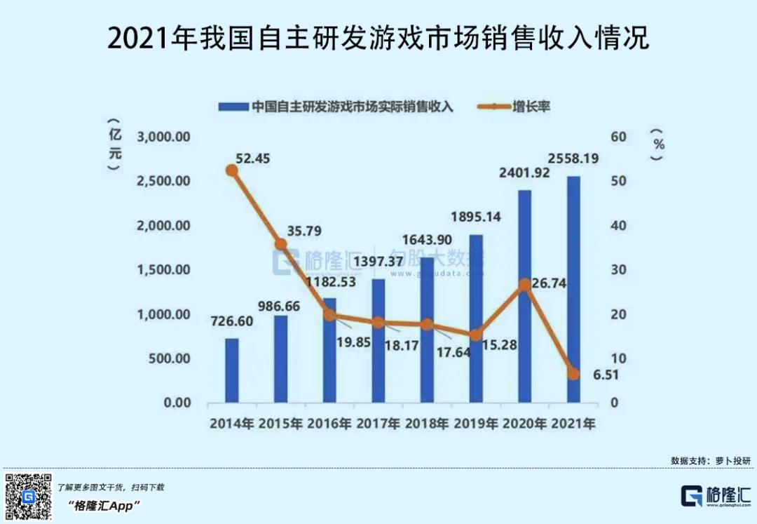 自研是一方面,2021年我国自研游戏市场销售收入2558.19亿元,同比增长6.51%,虽然增幅同比缩减约20%,但它依旧是游戏市场的收入主力军。