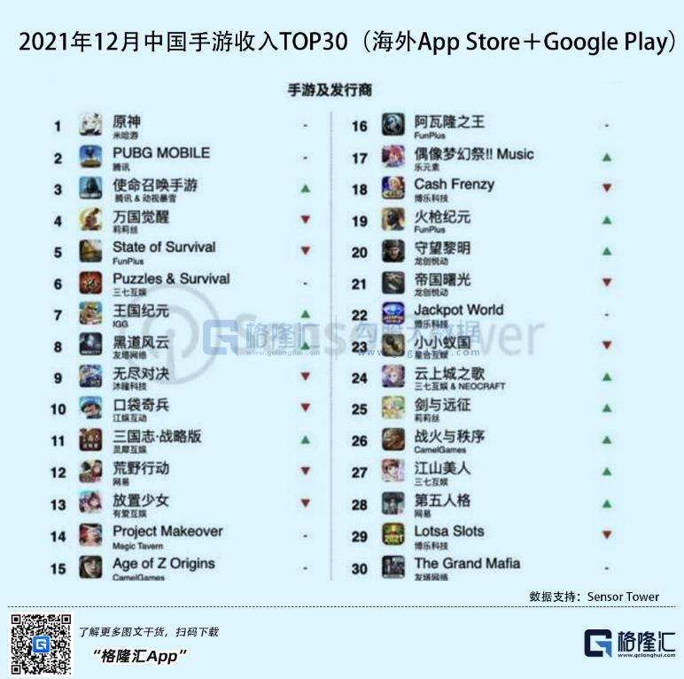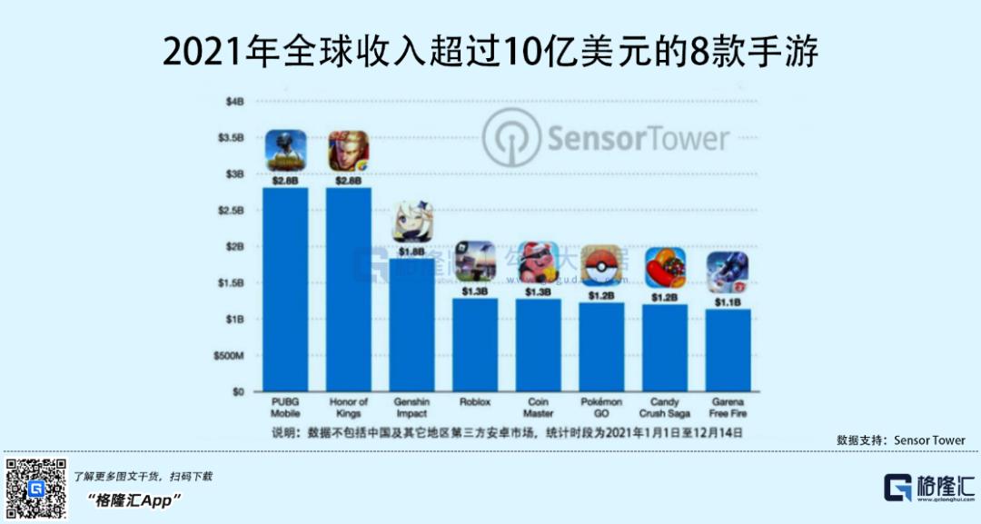 就拿米哈游出品的爆红的《原神》来说,2021年12月中国手游产品在海外市场收入及下载量排行榜上,《原神》移动端海外收入超过9600万美元,继续坐稳出海手游收入榜第一的宝座,腾讯《PUBG Mobile》、腾讯&动视暴雪《使命召唤手游》等紧随其后。