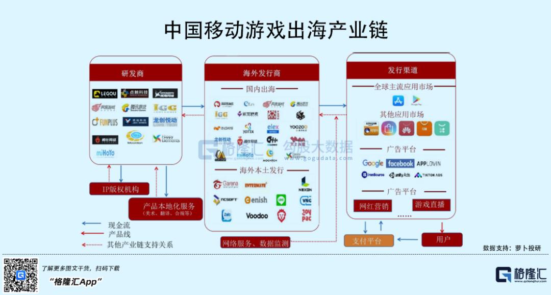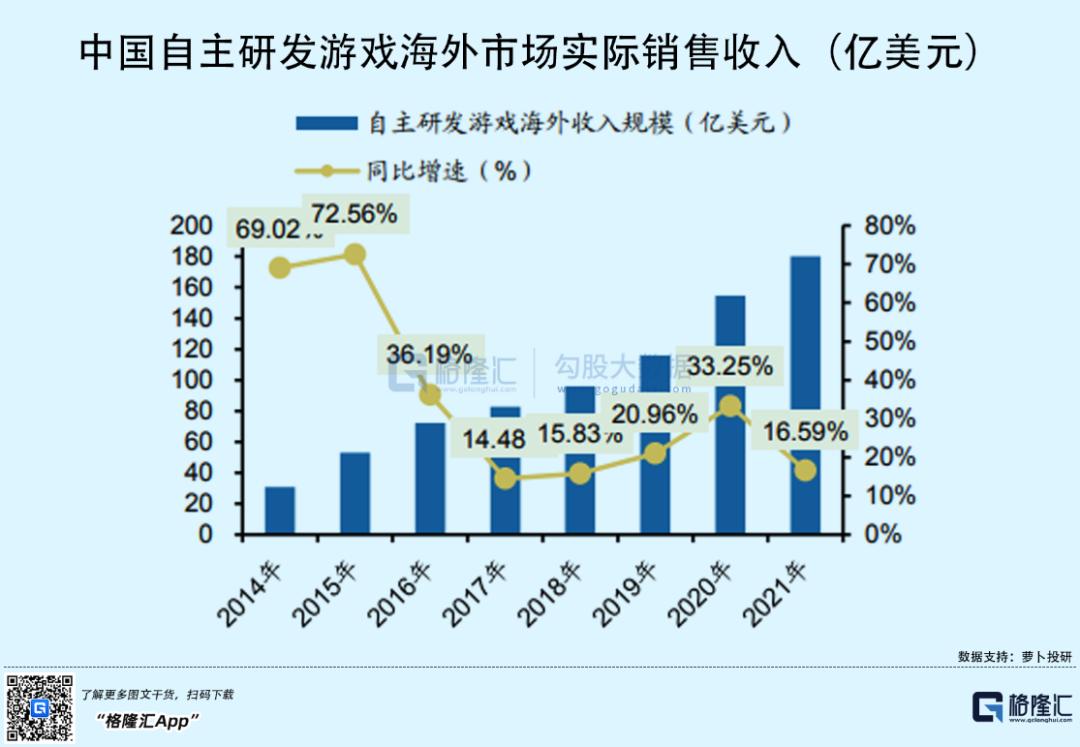 前面已经说过,除了引入海外热门IP做代理,自研产品的“走出去”打法很关键,2021年中国自主研发游戏海外市场实际销售收入达180.13亿美元,同比增长16.59%,主要受众市场包括美国、日本、韩国等。