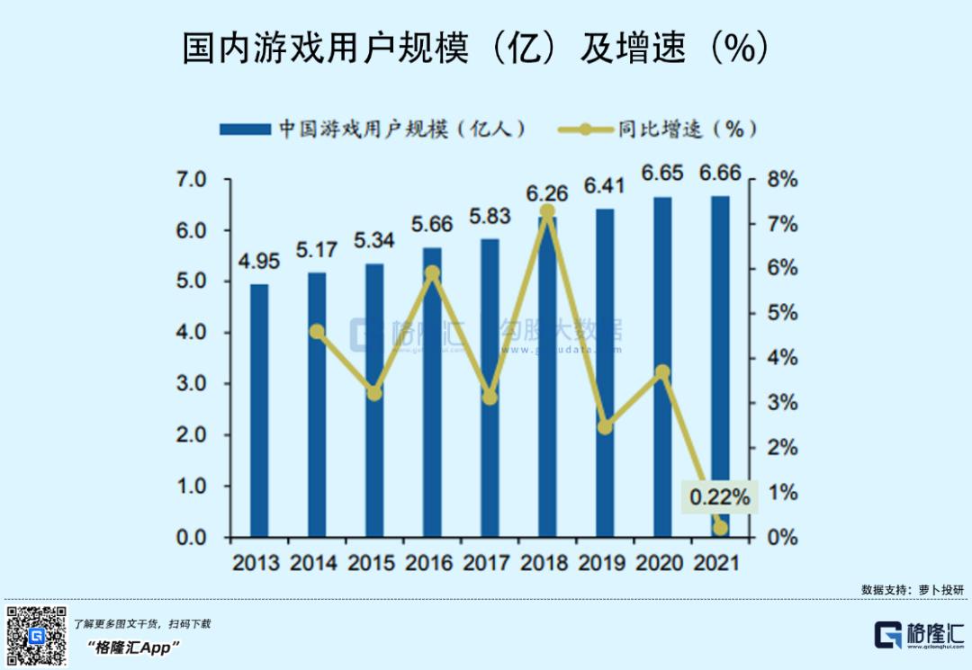 《2021年中国游戏产业报告》显示,中国游戏市场实际销售收入2965.13亿元,同比增长6.4%,增幅同比缩减近15%;且目前国内游戏用户规模6.66亿,同比增长0.22%,增长乏力,逐渐趋于饱和。