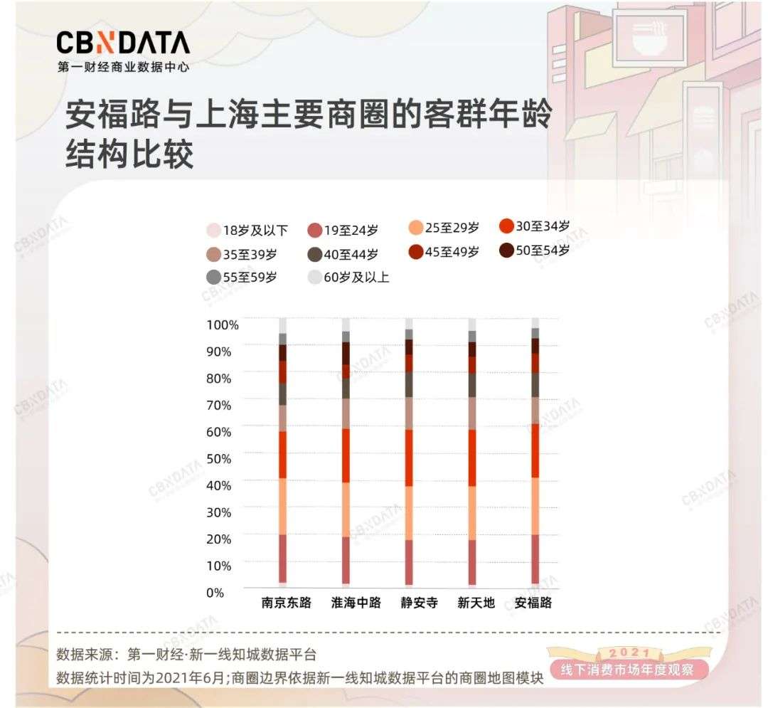 其三,年轻人在哪,品牌就去哪。网红街区之所以吸引品牌的入驻,庞大的客流量和更年轻的消费群体是不容忽视的原因。2021年黄金周,上海武康路就因为蜂拥而至的全国打卡游客而上了热搜。根据徐汇区政府的统计数据,国庆期间安福路每天的客流量超过了两万人。而新一线数据显示,淮海中路、安福路、新天地等几大网红街区,六成左右的客群年龄在34岁以下,29岁以下客群占了四成。