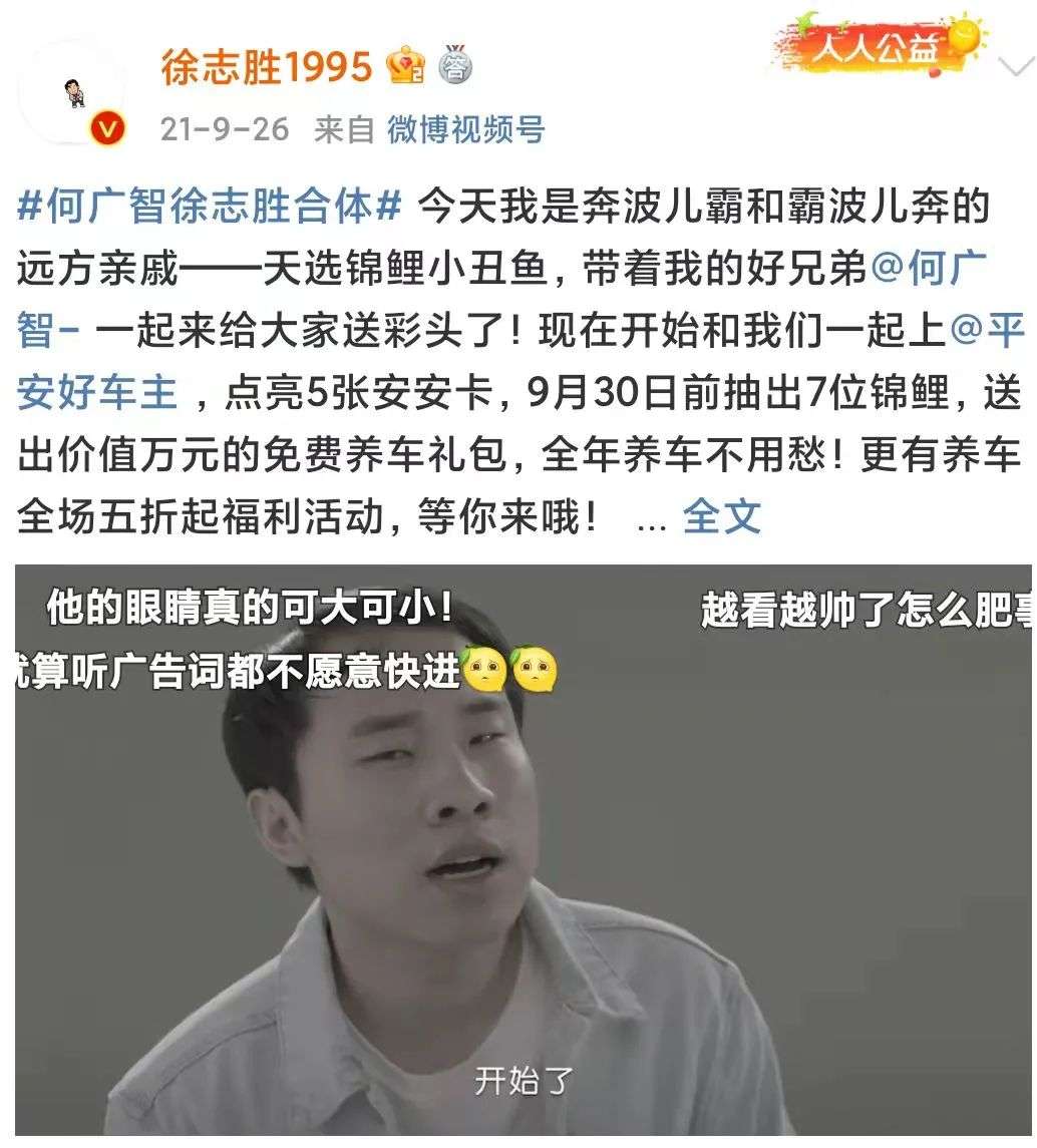 彼时正值9月下旬,趁着“广岛之恋”CP正热,平安好车主让徐志胜、何广智这对CP合体营业,还推出了#何广智徐志胜合体#的微博话题,最终话题阅读量达到2.5亿,讨论量也高达3.2万。