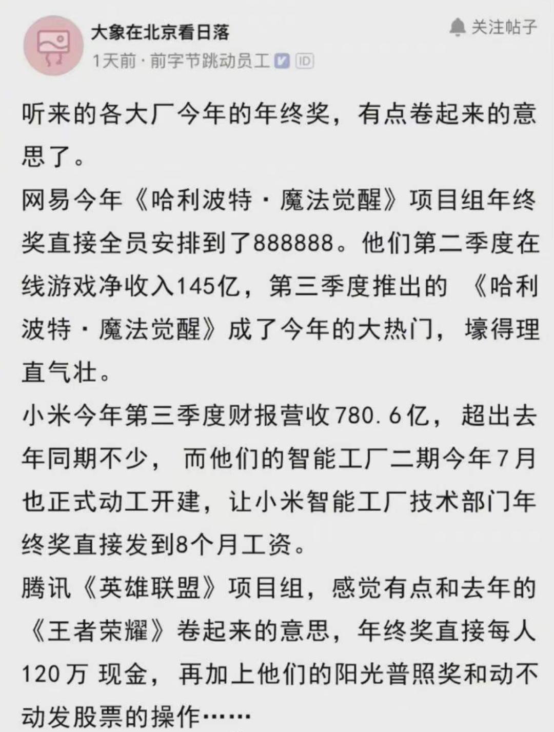 相应地作为回馈,据脉脉职言网友透露,网易《哈利波特·魔法觉醒》项目组年终奖高达888888元;而腾讯《英雄联盟》项目团队在每人120万元现金的年终奖上,再叠加阳光普照奖与股票。