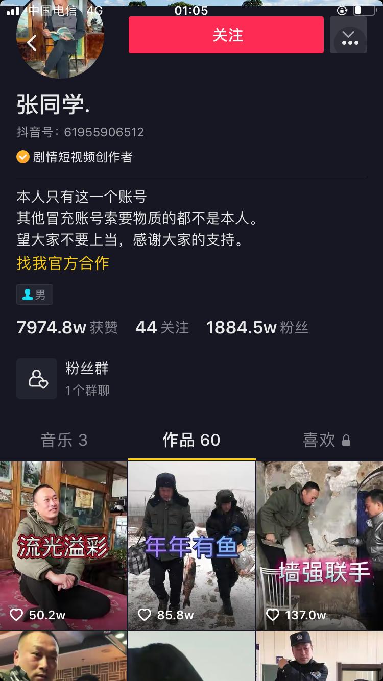 去年10月4日发布第一个视频,如今已拥有1884万粉丝,1月22日晚,“张同学”开始直播了。