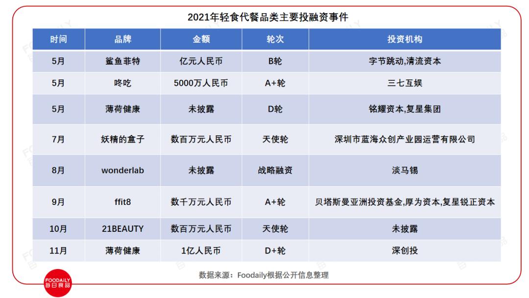 ffit8完成数千万人民币A+轮融资,鲨鱼菲特获得亿元级B轮融资,薄荷健康获1亿人民币D+轮融资······一批轻食代餐品牌正在强势崛起。