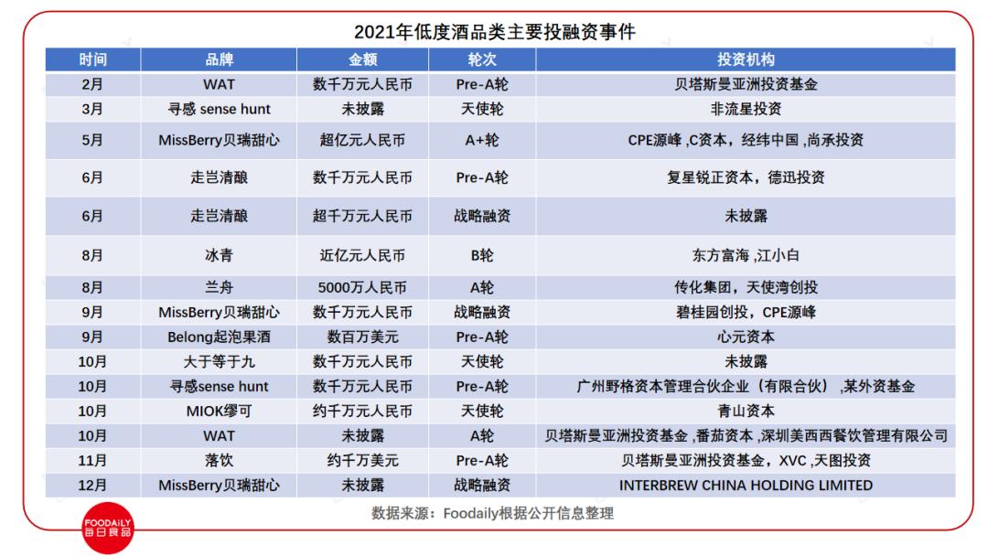 低度酒赛道中不仅有天图投资、经纬中国等耳熟能详的老牌投资方,百威、泸州老窖等传统酒业的“老玩家”,可口可乐、农夫山泉等饮料巨头也纷纷展开布局。