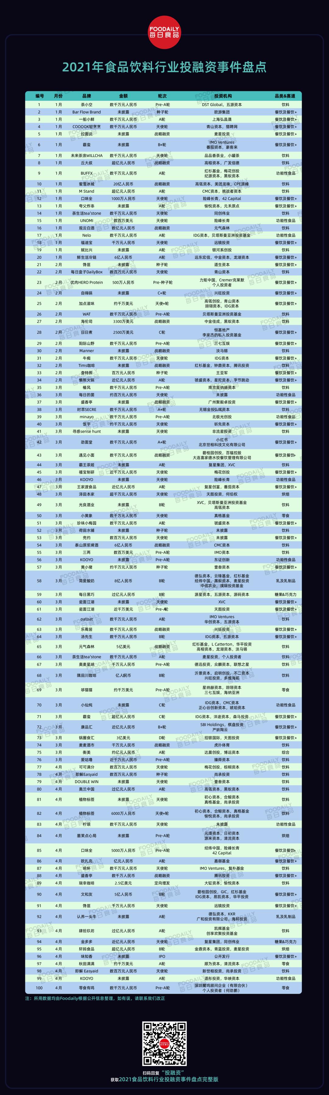 Foodaily后台回复“投融资”,即可获得“2021年食品饮料行业投融资事件盘点”完整版