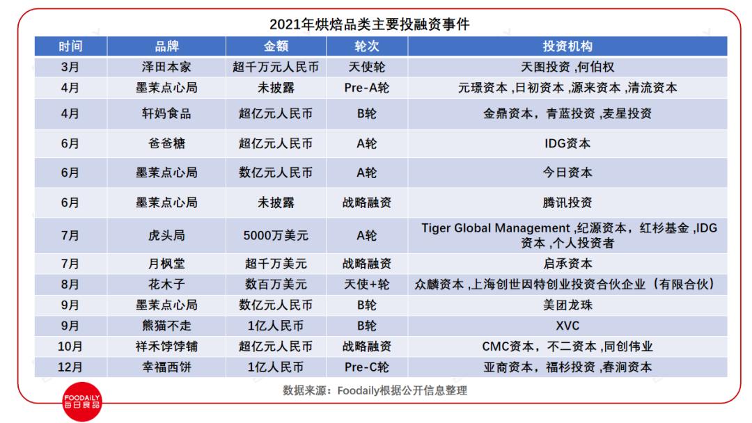 12月20日,幸福西饼对外披露完成1亿元战略融资,此次融资已经是幸福西饼的第五轮融资。9月24日,互联网烘焙品牌熊猫不走完成由XVC独家投资的1亿元B轮融资。