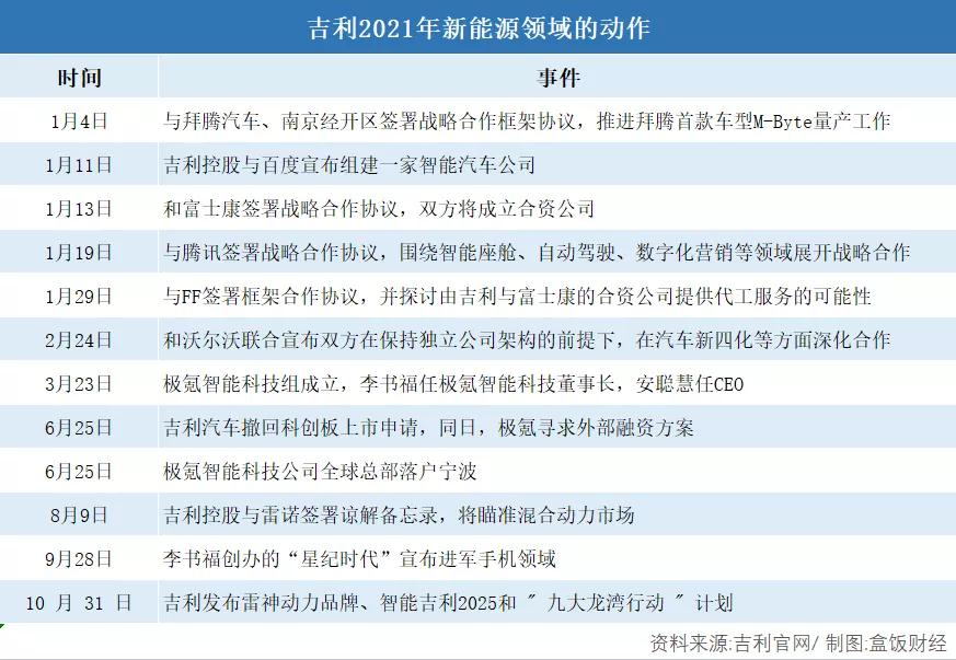 从今年的动作来看,李书福对于吉利的转型已经迫在眉睫。如在1月份,与腾讯签署战略合作协议,围绕智能座舱、自动驾驶、数字化营销等领域展开战略合作;10 月份,吉利发布 " 九大龙湾行动 " 计划, 5年研发投入1500 亿元、2025 年实现自动驾驶全栈自研以及 5年内推出 25 款以上全新智能新能源产品等。