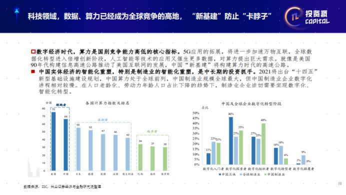 科技领域里面我们比较关注的是数据、算力,这里面如果落实下来,其实包括服务器高端芯片、信息安全、操作系统,这些都是我们缺的,这是第一个基础性层面。第二个层面就是应用里边的云计算、大数据、人工智能、物联网、5G的应用。第三个层面是对实体经济的赋能,工业互联网、金融科技、智能驾驶、智能医疗、智能制造、智慧城市,这些我认为空间还是蛮多的,但是它比较琐碎。