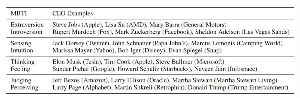 近日,德国和意大利的联合研究采用了一种新方法来制定这种性质的预测框架,通过使用公开数据将 32 位大企业 CEO 的言论映射到 Myers-Brigg 类型指标框架 ( MBTI )上。