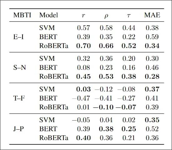 研究测试了 BERT ( base )、RoBERTa ( base ) 和支持向量机 (SVM)等多个模型 ,。训练后,发现 RoBERTa 表现最好。在下图中,我们看到了模型对马斯克个性的各种估计: