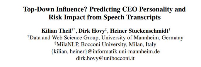 「在风险回归任务中,我们表明预测的 CEO 性格与股票收益波动形式的财务风险显著相关。定性地讲,外向、直觉和思考类型的 CEO ,投资其公司股票面临的经济风险较低。」