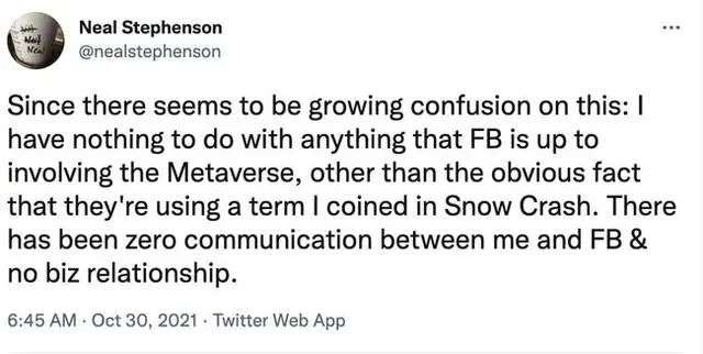 当扎克伯格将自己的公司改名为元宇宙之后,《雪崩》的作者史蒂芬森却公开澄清,“我和脸书之间的交流为0,没有任何商业关系,他们只是使用了我在《雪崩》中创造的术语”。