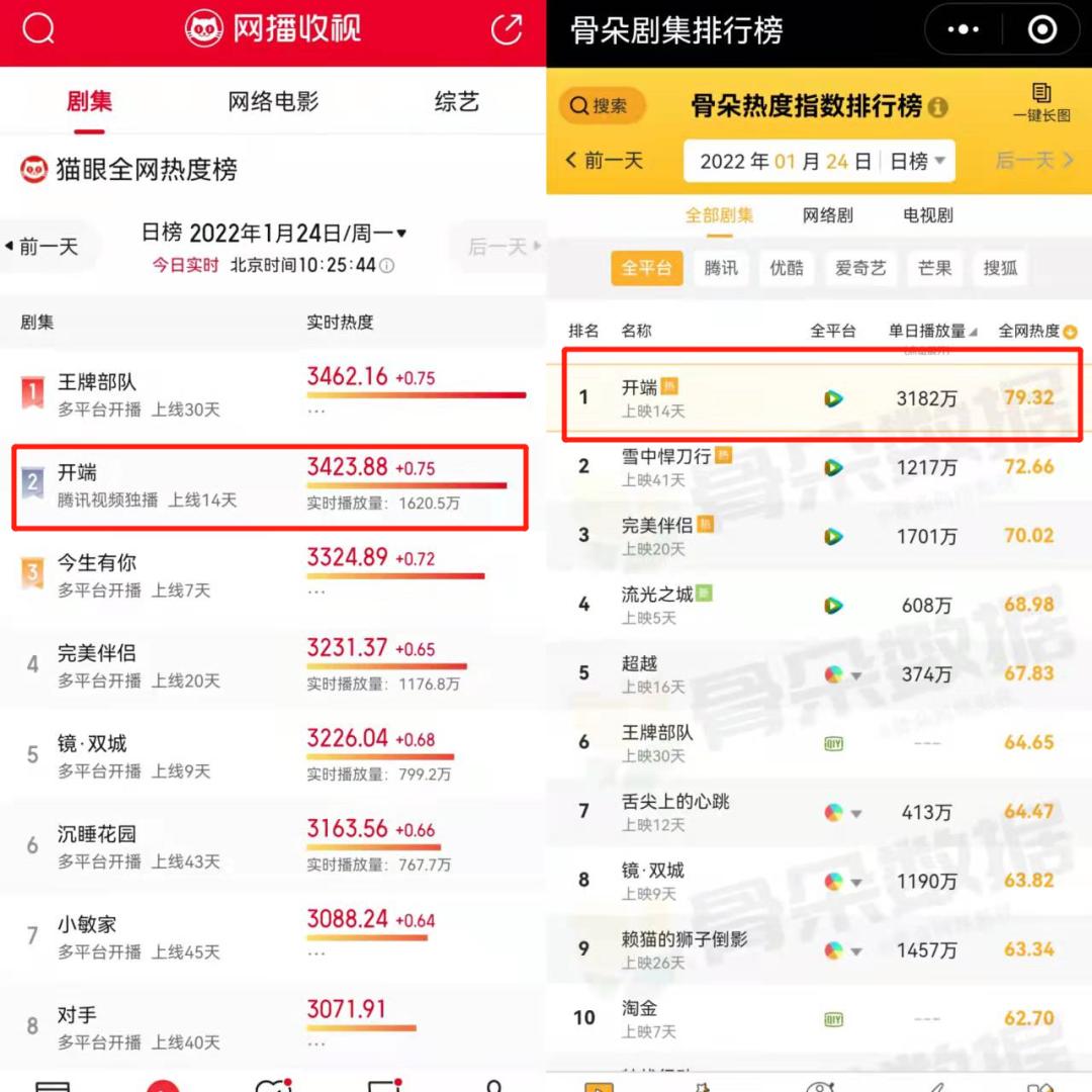 截止目前,作为腾讯视频的独播剧,《开端》仅靠13集,播放量就已经突破11亿大关。在猫眼专业版、骨朵影视等数据榜单上,其热度也稳居前二。同时,这部剧还以每天最多十几个热搜的频率刷屏微博,#电视剧开端#的话题已经引发了37亿的阅读和245.1万次讨论,而达成这个数字的时长,不到两周。