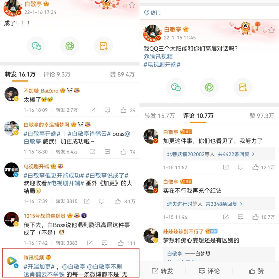 上线一周以来,《开端》几乎是焊在了微博热搜上,每天热搜词条最多能有十几个,主创们为了这部剧也是玩梗不断,白敬亭还发微博@腾讯视频 称要求与高层对话申请加更,后者自然也“同意”了他的请求,在1月19日提前更新了一集。