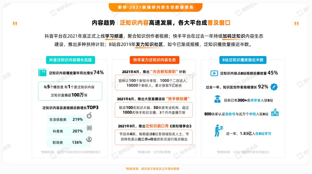 据新榜报告,抖音平台在2021年底正式上线学习频道,聚合知识创作者视频;快手平台在过去一年持续加码泛知识内容生态建设,推出多种扶持计划;B站自2019年发力知识社区,如今已渐成规模,泛知识播放量接近半数。