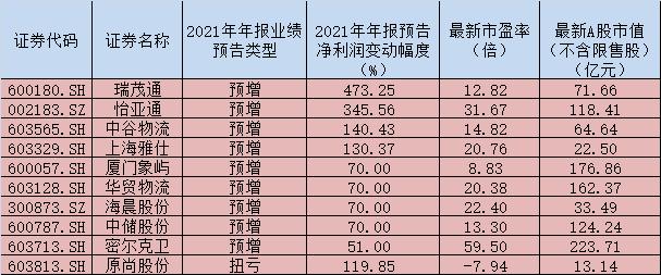 此外,物流行业喜报迭出。在已披露的2021年年报预告的13家公司中,共有12家公司业绩表现预喜。其中,瑞茂通、怡亚通、中谷物流、上海雅仕、原尚股份等5家公司净利润有望实现同比翻番。