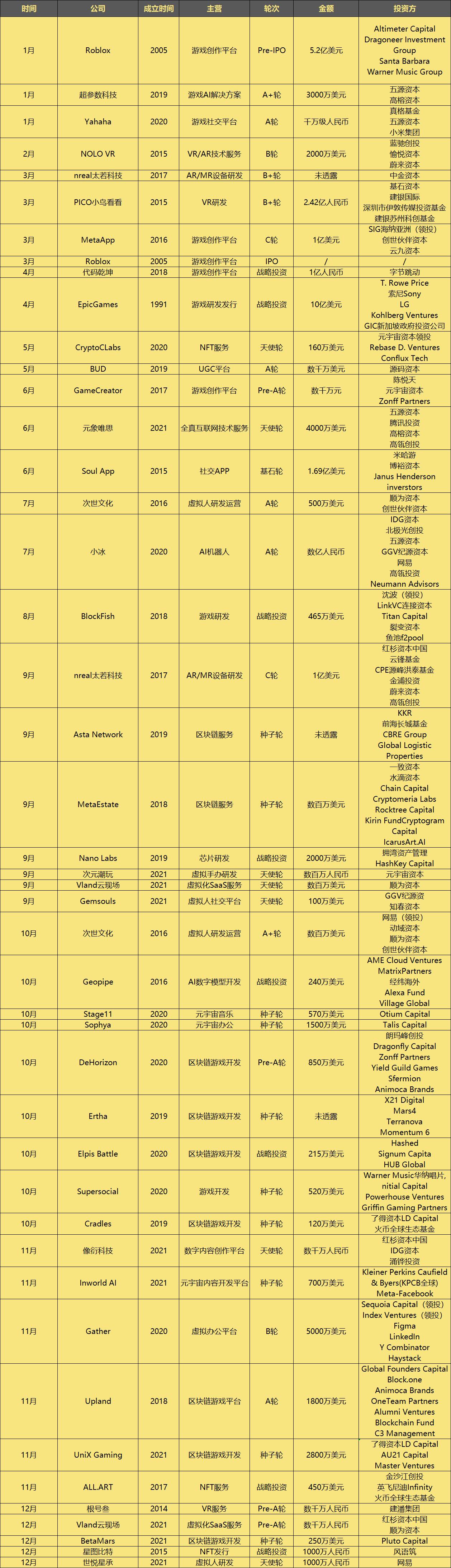 如果按照元宇宙“BIGANT”六大核心要素来看,几乎所有融资都是元宇宙相关,太多太杂,所以有饭只选了2021年在融资消息、公司主营业务形容提到元宇宙的。