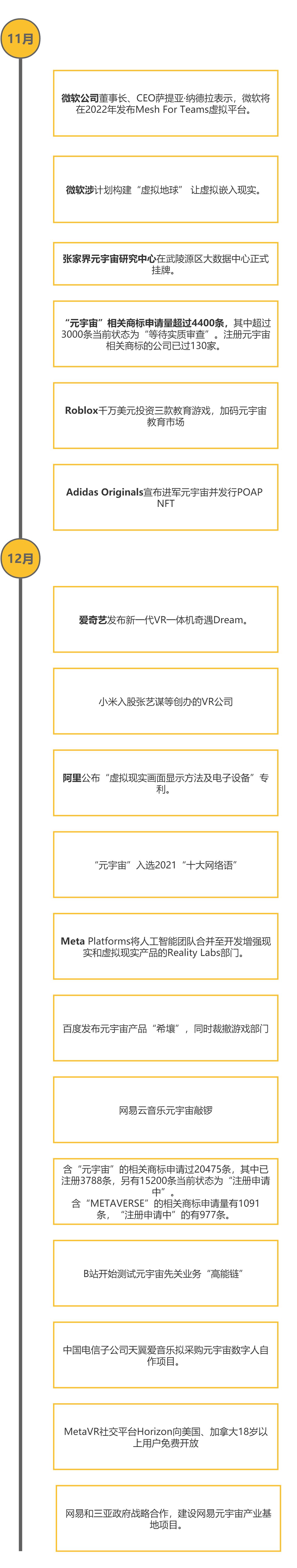 所以,我们分企业观点、投融资、主要事件三个部分,做了一个2021元宇宙时间轴。